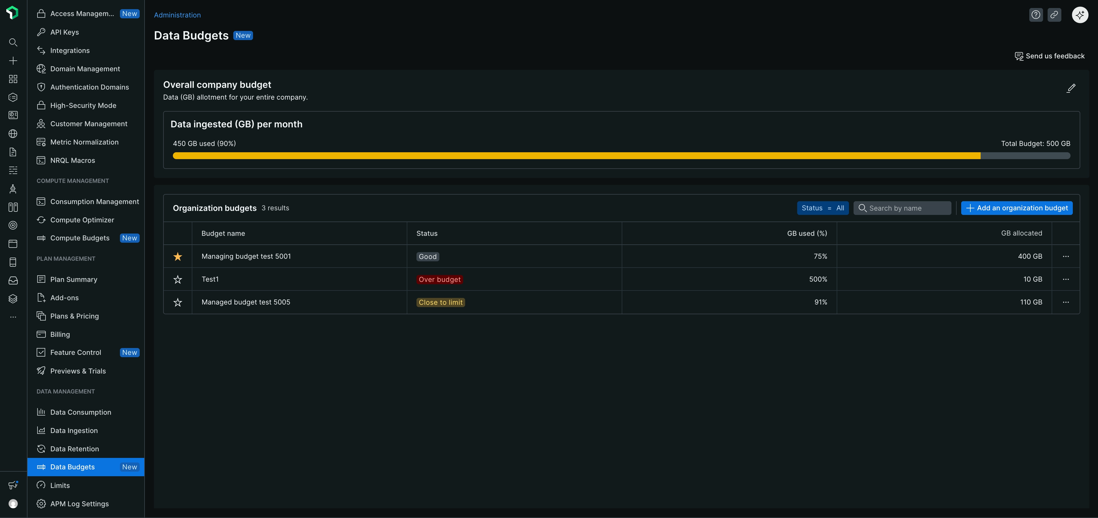 - Company level budgets: Track total data ingestion across all organizations in your multi-tenant setup