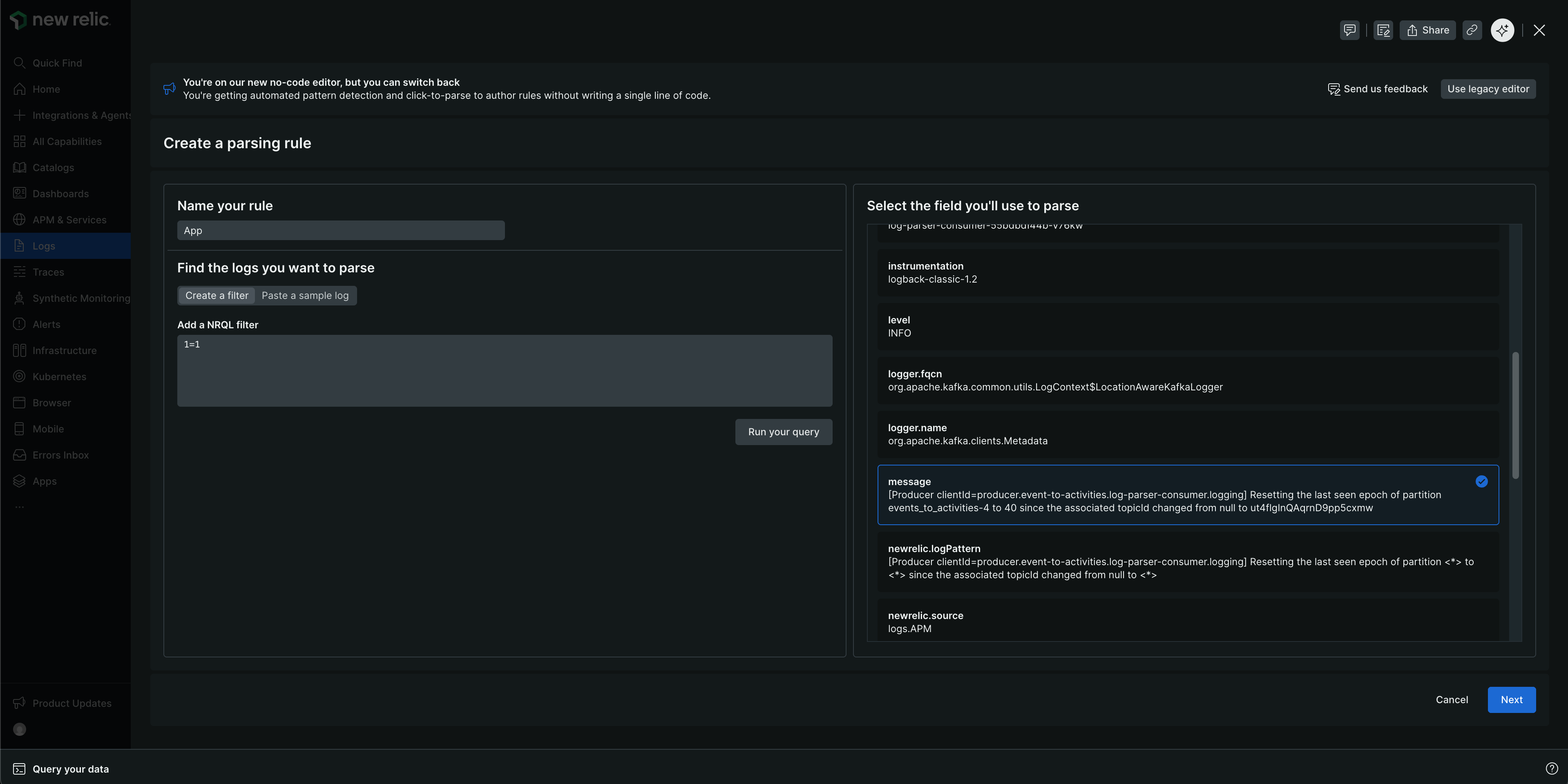 If you paste a sample log, you must define the NRQL WHERE clause to match your logs, select the field you want to parse, and click Next.