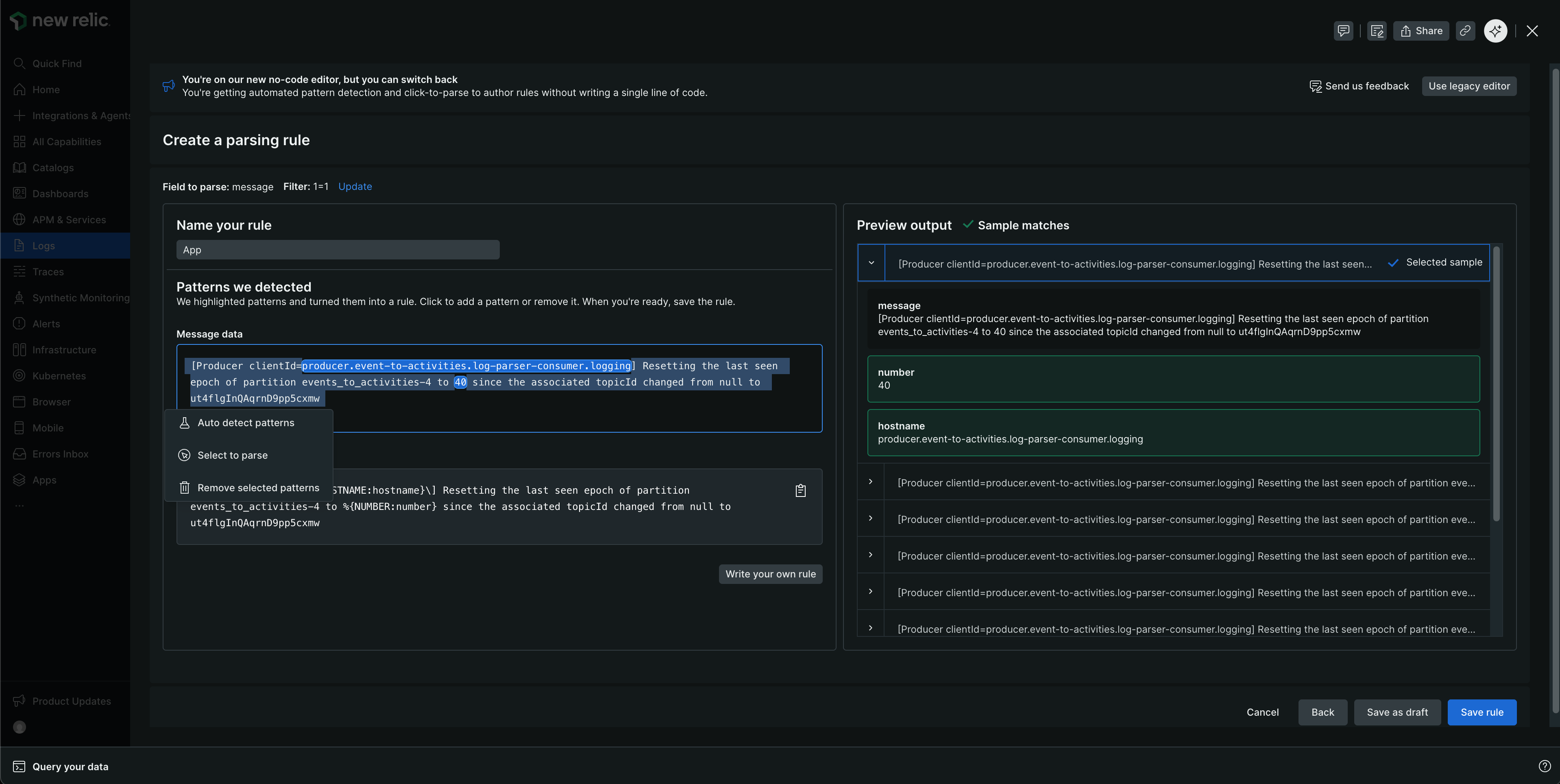 Use No Code Log Parsing to detect and extract fields from your sample logs. New Relic analyzes your sample logs and suggests patterns you can configure.