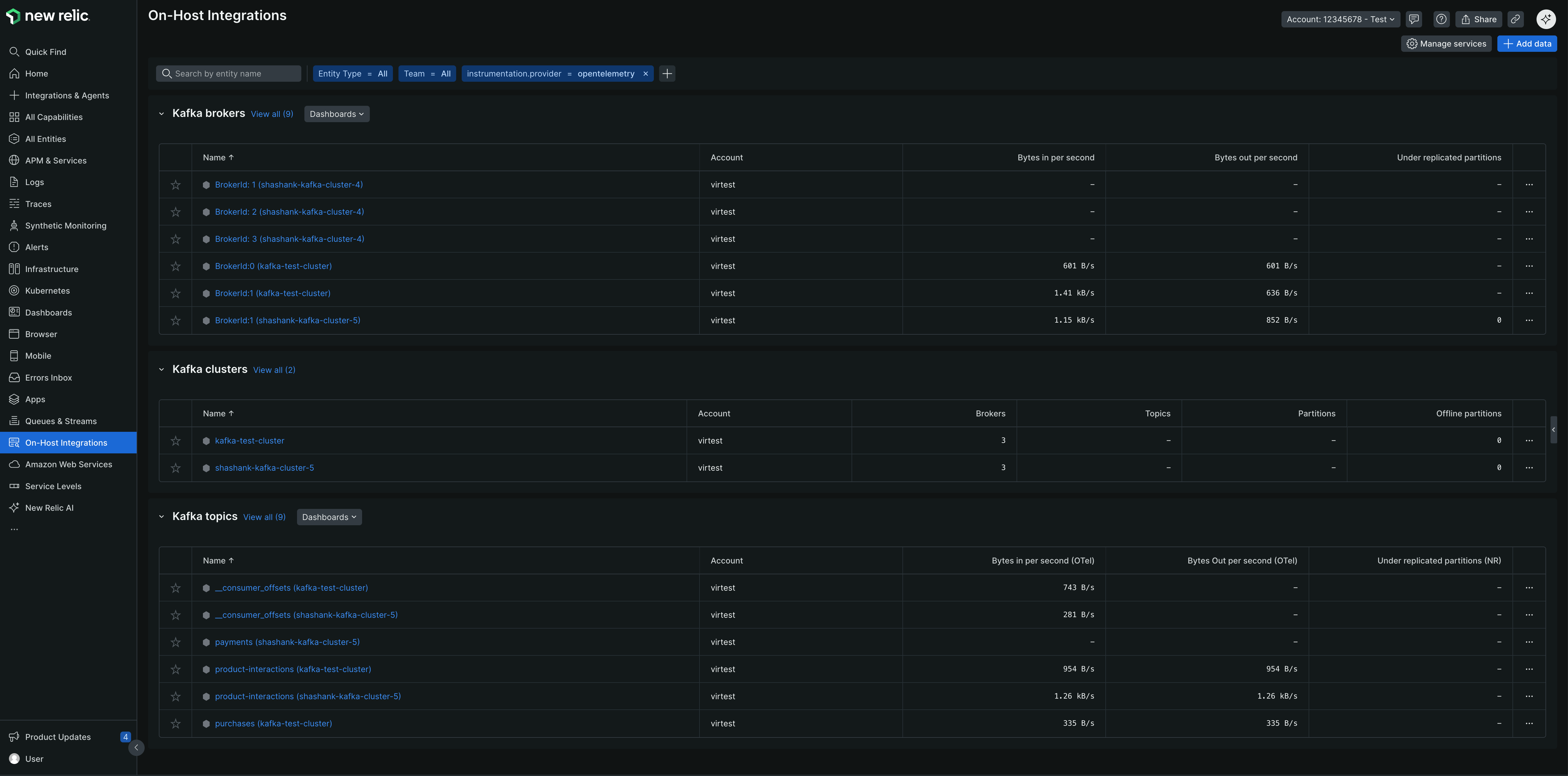 Vá para one.newrelic.com > All capabilities > Queues & Streams Filtre por provider=opentelemetry e clique na linha da conta onde você instrumentou o Kafka para visualizar seus dados /* ### 3. Serviços de terceiros Ideal para: Monitoramento focado em integração 1. Vá para <DNT>**[one.newrelic.com](https\://one.newrelic.com) > All capabilities > Infrastructure > Third-party services**</DNT> 2. Select <DNT>**Kafka (OpenTelemetry)**</DNT> > <DNT>**OTel Kafka Dashboard**</DNT> <img title="Serviços de terceiros OTel Kafka" alt="Visualização de serviços de terceiros mostrando a integração do Kafka (OpenTelemetry)" src="/images/infrastructure_screenshot-crop_otel-kafka-third-party-integrations.webp" /> */