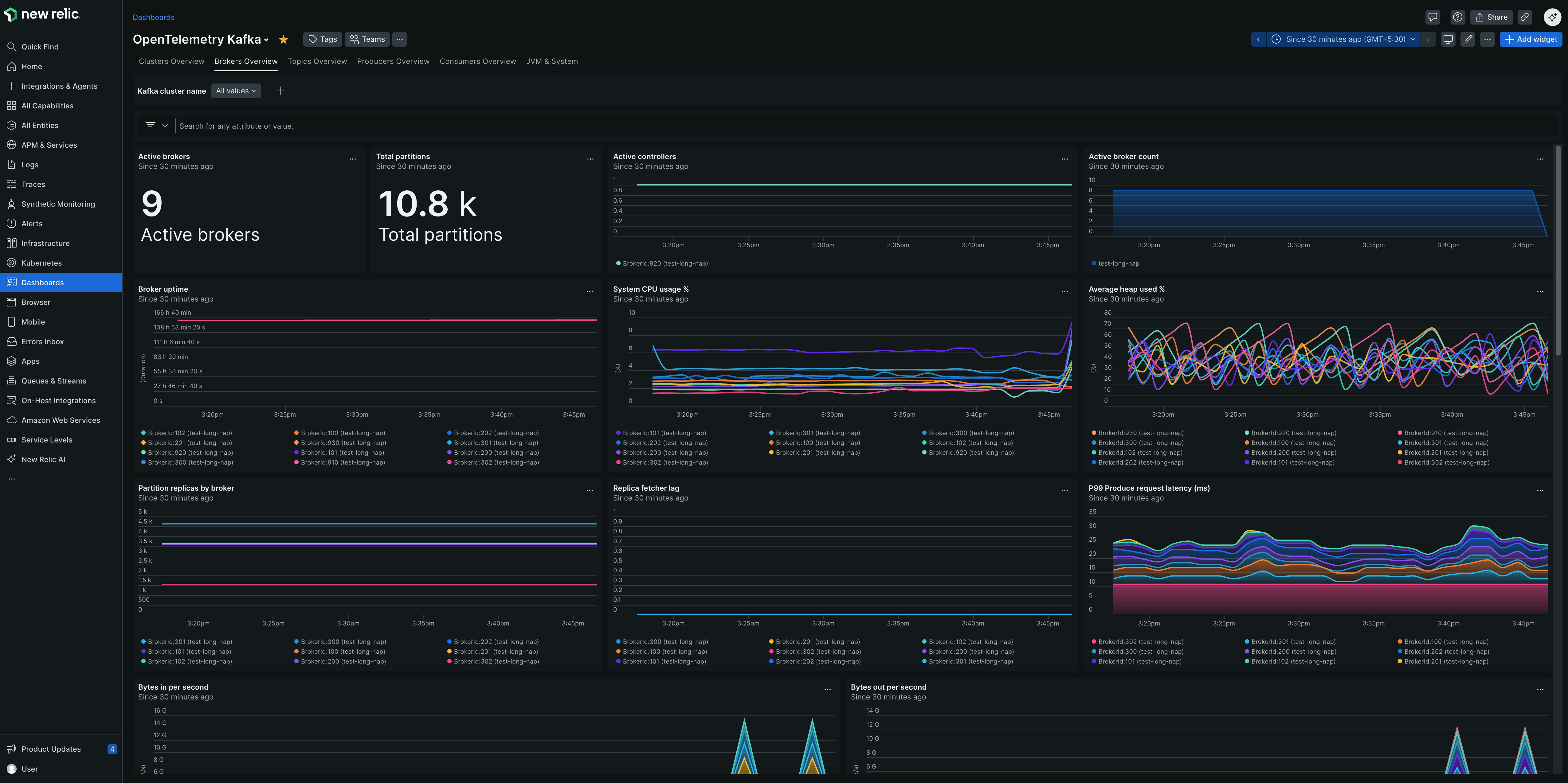 Vá para one.newrelic.com > Dashboards > Recommended dashboards (View all) Pesquisar por "OTel Kafka Dashboard" Consulte dados do Kafka com NRQL Use NRQL para criar consultas e dashboards personalizados para seus dados Kafka.