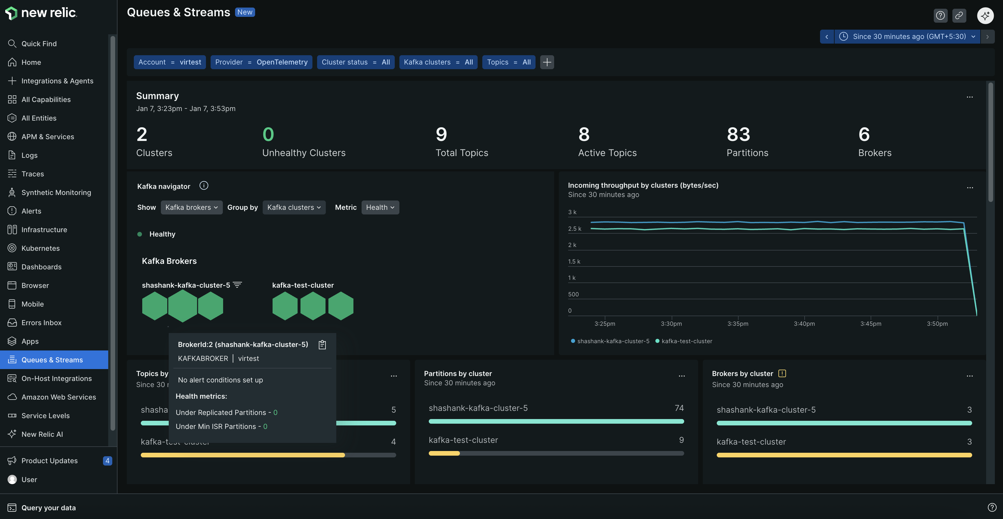 Vá para one.newrelic.com > All capabilities > On host integrations Visualize os tipos de entidade de broker, cluster e tópicos do Kafka 2. Filas e Streams Ideal para: Monitoramento focado em fila de mensagens